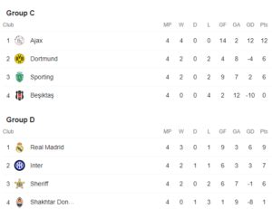Mu itsinda rya C, ikipe ya Ajax nayo yongeye gutsinda ikipe ya rutahizamu Erling Haaland Borussia Dortmund kuri ubu uri mu mvune ibitego 3-1 aho umunya Ivory Coast Sebastian Haller yongeye kwigaragaza atsinda igitego mu irushanwa rya Champions League. Ikipe ya Sporting Club de Portugal yandagaje ikipe ya Beskitas aho yayitsinze ibitego bine ku busa(4-0) byatsinzwe na Pedro Goncalves watsinze ibitego 2, Paulinho na Pablo Sarabia.