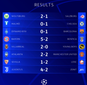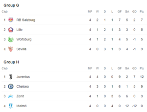 Mu itsinda H, ikipe ya Chelsea idafite rutahizamu wayo Lukaku kubera ikibazo cy’imvune yatsinze ikipe ya Malmo yo mu gihu cya Sweeden 1-0 cyatsinzwe na Hakim Ziyech. Ikipe ya Juventus yatsinze mu buryo bukomeye ikipe ya Zenit St Petersburg yo mu gihugu cy’u Burusiya ibitego 4-2 bya Paul Dybala watsinze ibitego bibiri, Frederico Chiessa na Alvaro Morata.