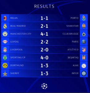 Mu itsinda rya D, ikipe ya Real Madrid ya Karim Benzema yatsinze ikipe ya Shakhtar Donetsk ibitego 2-1 byatsinzwe na rutahizamu w’umufaransa Karim Benzema byombi ku mipira yari ahawe na Vinicius Junior. Muri iri tsinda kandi ikipe ya Inter de Mlana yo mu Butaliyani yatsinze ikipe ya FC Sheriff ibitego 3-1 byatsinzwe na Alexis Sanchez, Milan Skriniar na Marcello Brozovic.