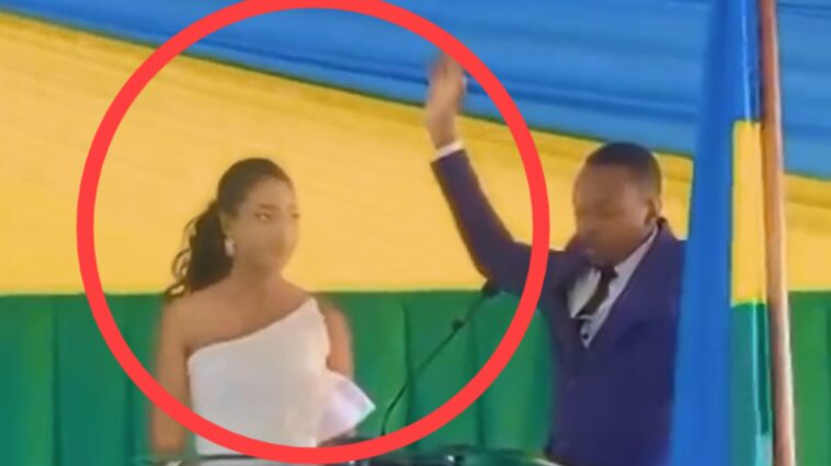 Ubwo umugabo yari afashe ku idarapo ari kurahira yageze mo hagati arangije ahita asoma umugore we ku gahanga ni uko maze abari mu murenge bose bavuza induru yibyishimo.