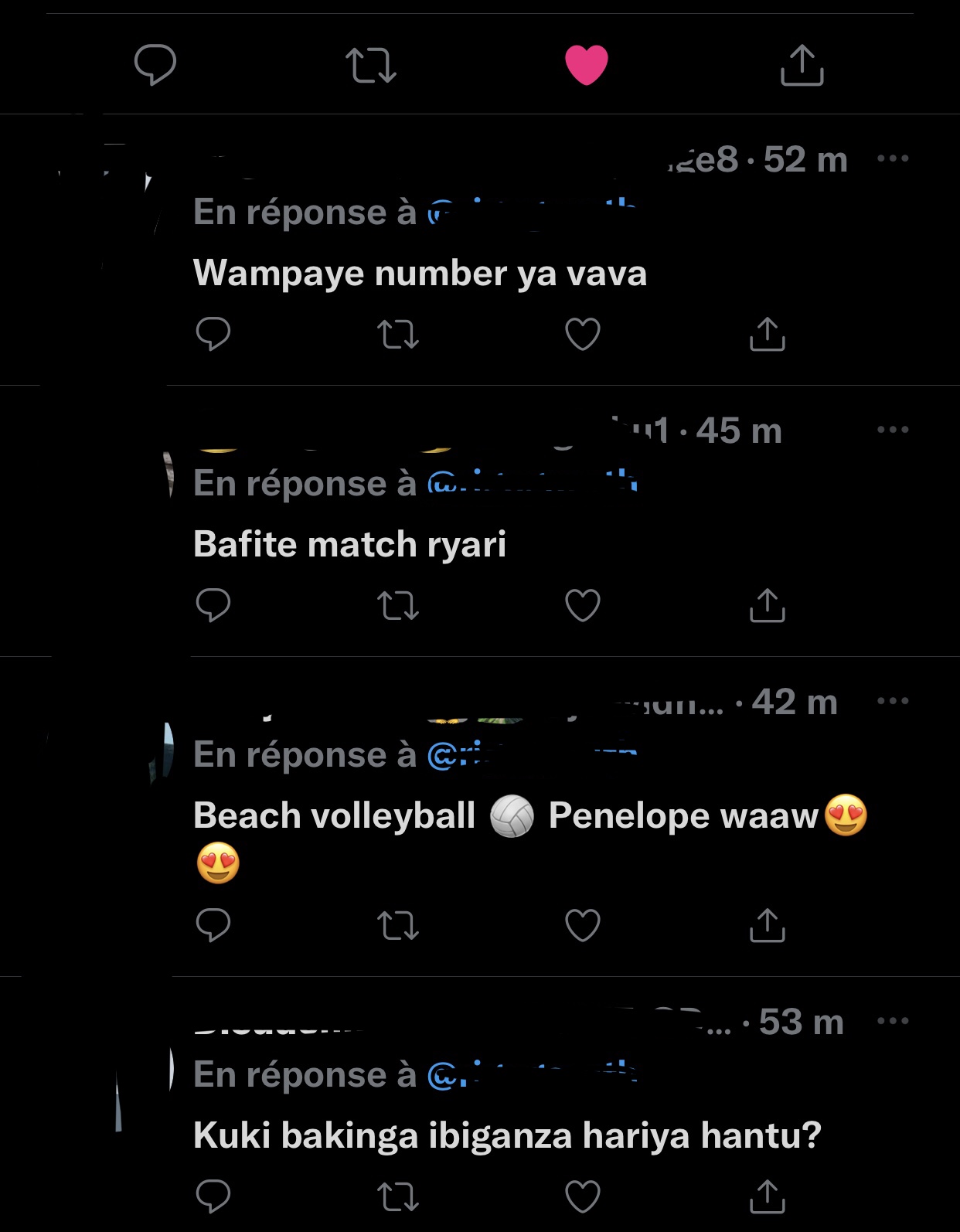 Ku rubuga rwa Twitter hashyizwe amafoto agaragaza abakobwa babiri, Vava na Penelope, bakinira ikipe ya APR Volley-ball Club maze bamwe mu bayabonye biganjemo abasore barwanira gusaba nimero zabo.