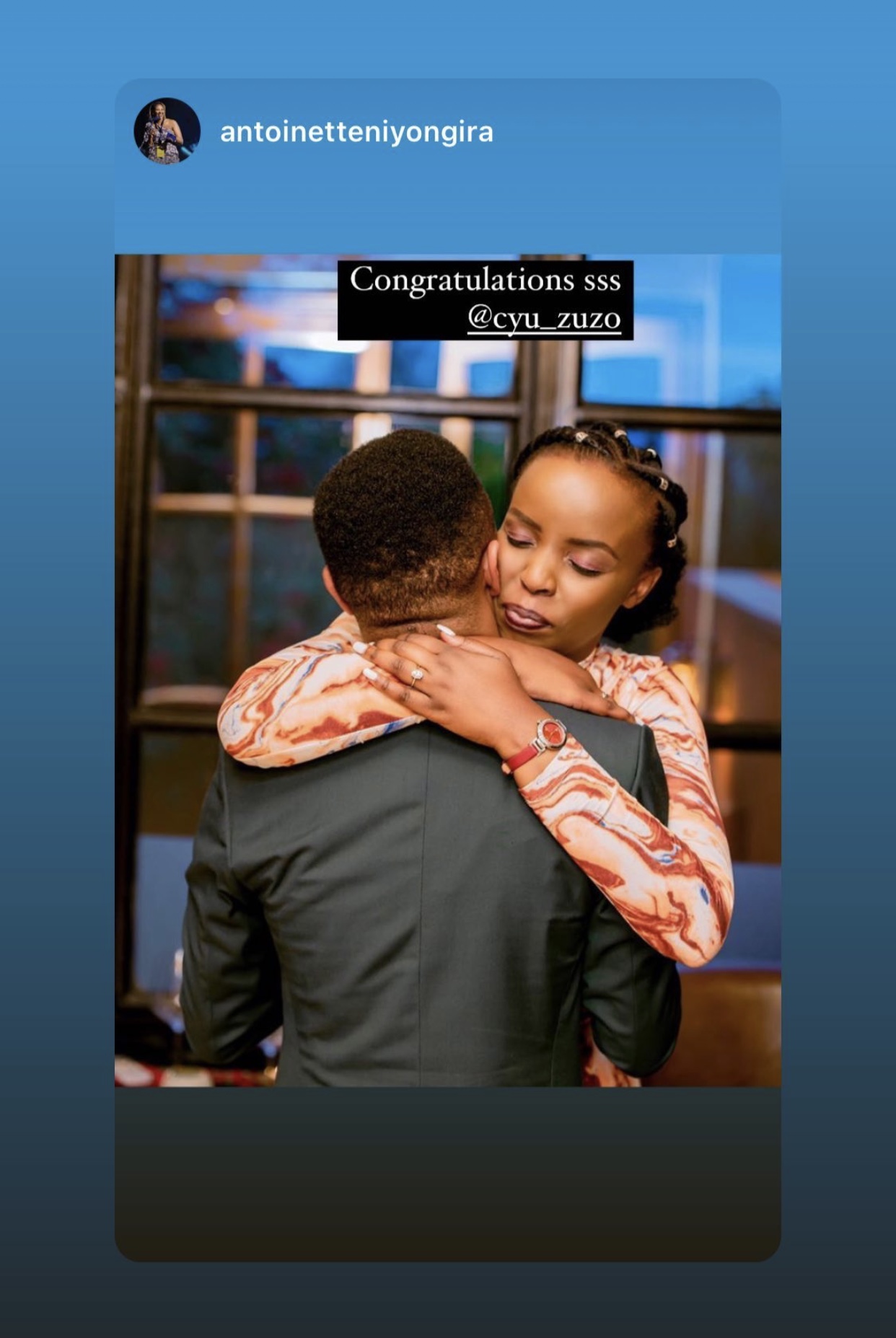 Antoinette Niyongira yagize ati « Congratulations Sss @cyu_zuzo ».