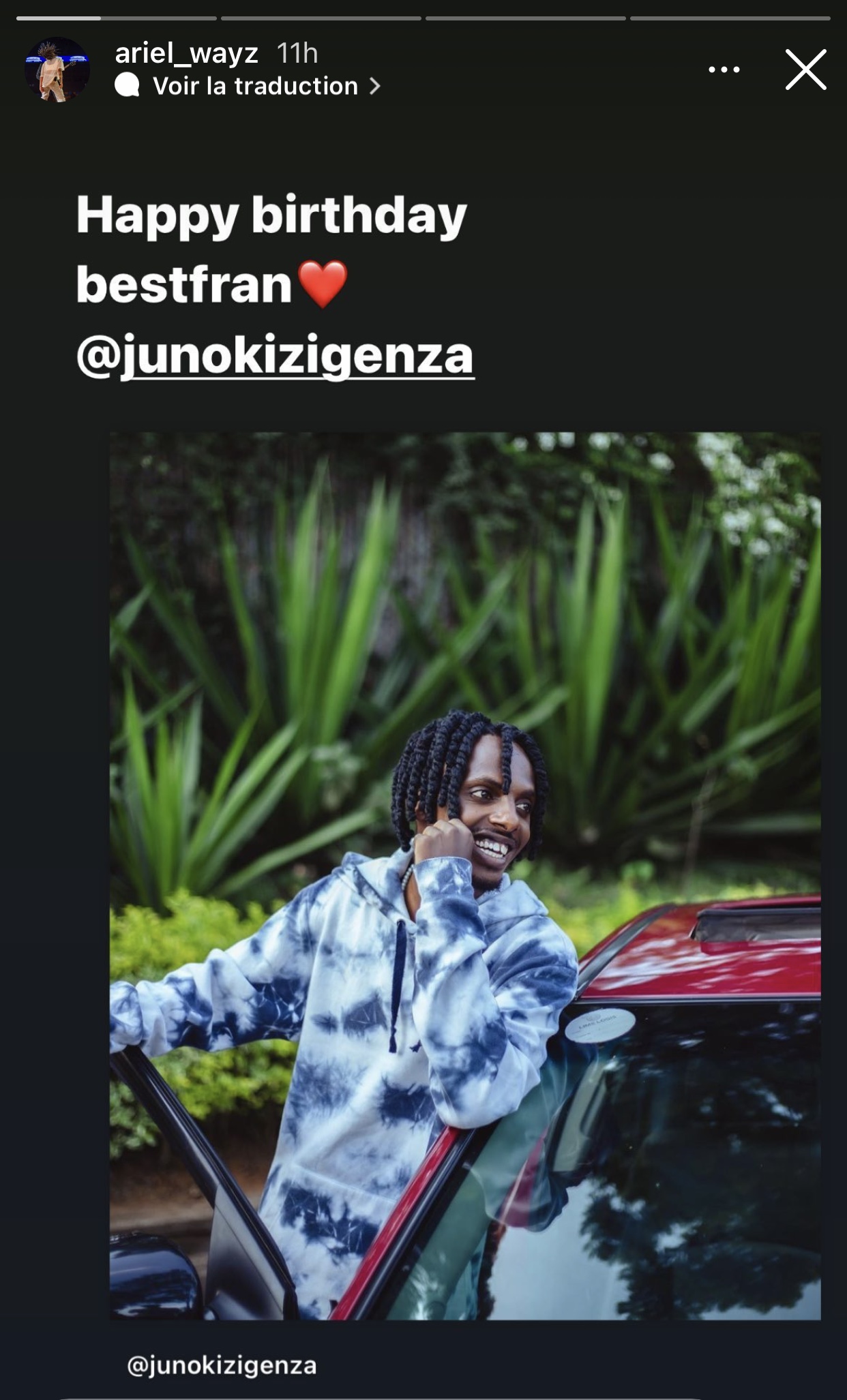 Ariel Wayz, umwe mu nshuti za hafi za Juno Kizigenza, abinyujije kuri story ya instagram ye yanditse amagambo agira ati « Happy birthday bestfran❤️ @junokizigenza ».