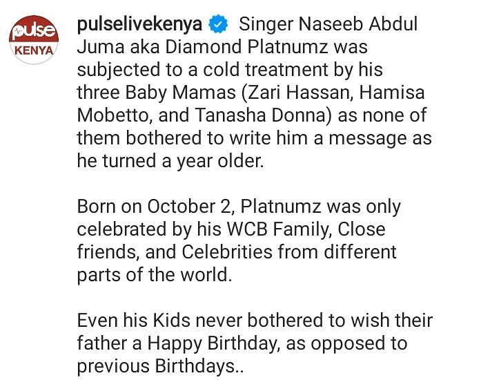 Diamond Platnumz wabyaranye na Zari abana babiri, Hamisa Mobetto umwe na Tanasha Donna umwe, ubusanzwe bajyaga bamwibuka ku munsi we w’amavuko(ntihaburaga ubikora) ariko kuri iyi nshuro nta n’umwe wabikoze, yaba kumushyira ku nkuta zabo z’imbuga nkoranyambaga cyangwa se kuvuga ku butumwa bwe yashyize ku rukuta rwe.
