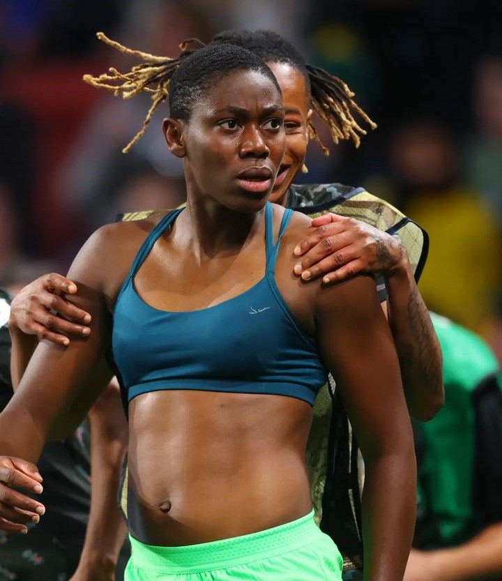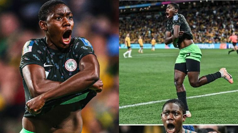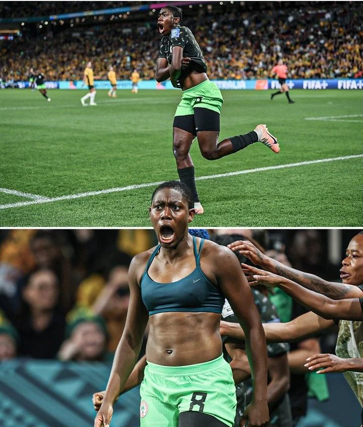 Assisat Oshoala abaye Umunya-Nigeria wa mbere utsinze mu bikombe by’Isi 3 bitandukanye nyuma y’aho muri uyu mukino atsinze igitego maze akishimira akuramo umwenda yari yambaye.