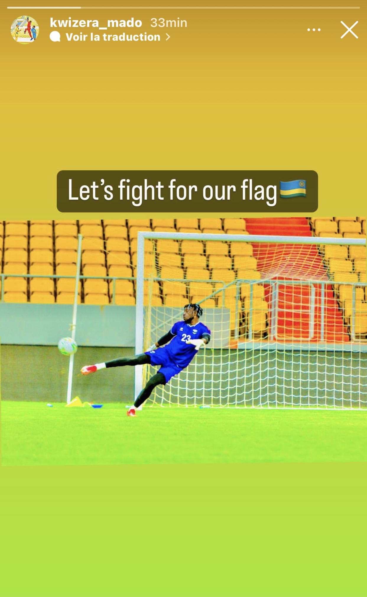 Kwizera Olivier, umuzamu w’ikipe y’U Rwanda, Amavubi, abinyujije kuri story ya instagram ye yagize amagambo atangaza mbere y’uyu mukino. Kwizera Olivier yashyize hanze ifoto ye maze ayiherekesha amagambo agira ati « Let’s fight for our flag 🇷🇼» .