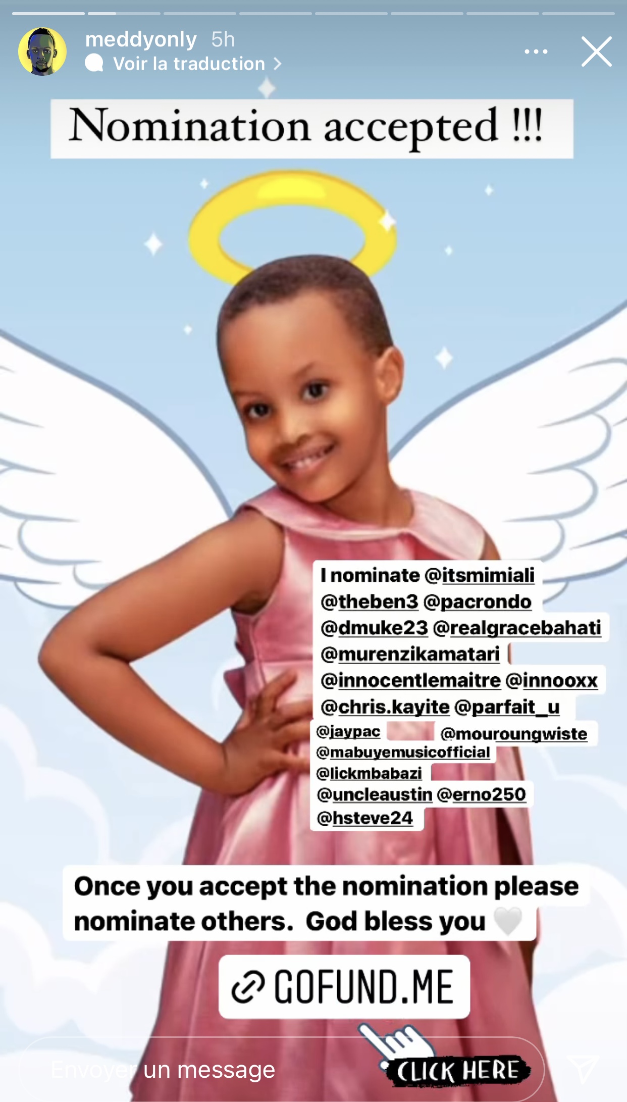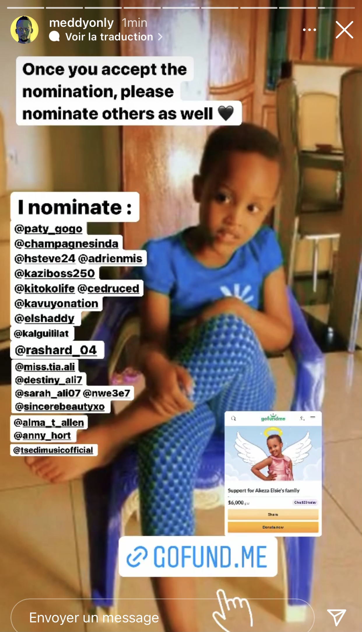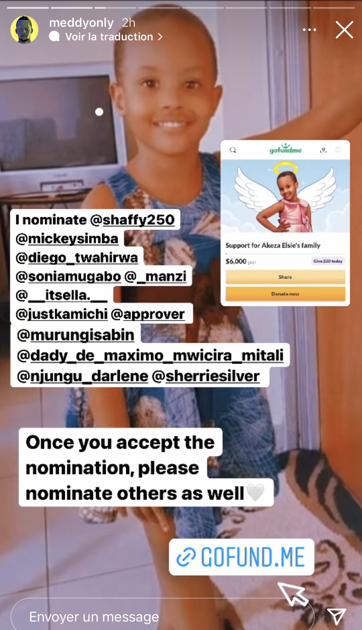 Abinyujije kuri story ya instagram ye, Meddy yashyizeho ko abashaka gufasha Akeza Elsie baraza gukanda kuri link iri muri bio ye maze anasaba inshuti ze n’abantu be ba hafi barimo umugore we, Mimi, umuhanzi The Ben, Christian Kayiteshonga, umuhanzi Kitoko, umuhanzi Emmy, Ernesto Ugeziwe ndetse n’abandi benshi b’inshuti ze ko bakwitabira iki gikorwa cyo gufasha umuryango wa Akeza Elsie.