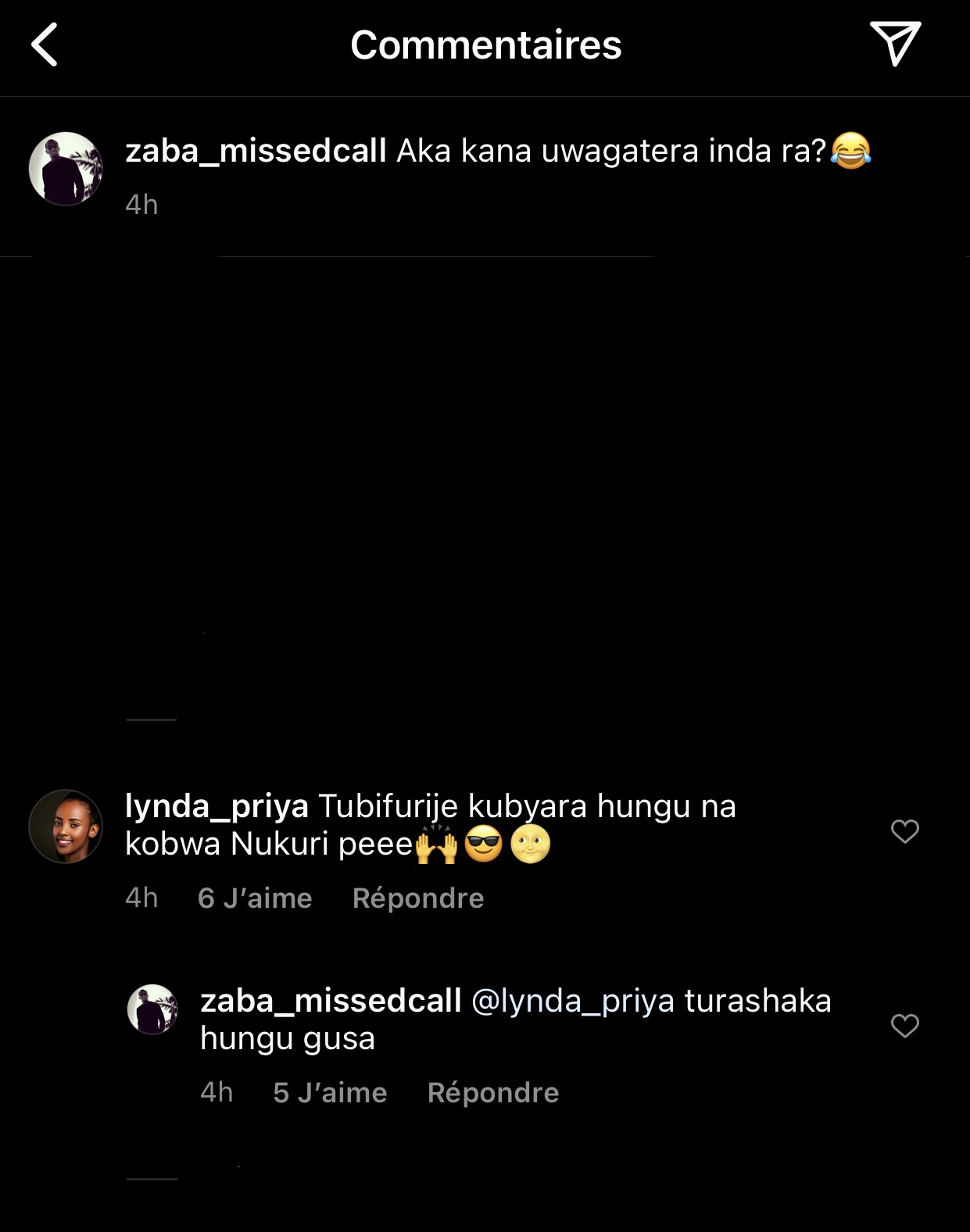 Nyuma yo kumva aya magambo Zaba yari amaze gutangaza, Miss Lynda yahise yandika amagambo  agira ati « Tubifurije kubyara hungu na kobwa Nukuri pe 🙌🏼😎🌝 ».
