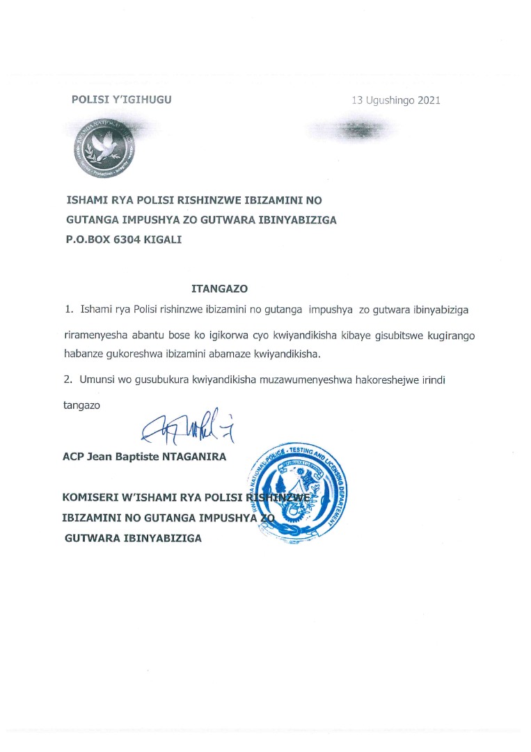 Polisi y’u Rwanda yashyize ahagaragara itangazo rimenyesha abantu bose ko igikorwa cyo gukomeza kwiyandikisha ku bashaka gukorera impushya z’agateganyo n’iza burundu ko iki gikorwa kibaye gisubitswe kugirango habanze hakorwe ibizamini by’abiyandikishije mbere.Polisi y’u Rwanda yongeraho ko igihe iki gikorwa kizasubukurirwa kizamenyeka mu minsi iri imbere.