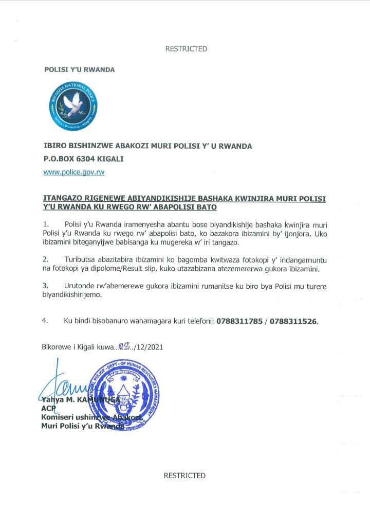 Polisi y’U Rwanda ibinyujije ku rukuta rwayo rwa Twitter yashyize hanze itangazo rigenewe abantu bose biyandikishije bashaka kwinjira muri Polisi y’U Rwanda.