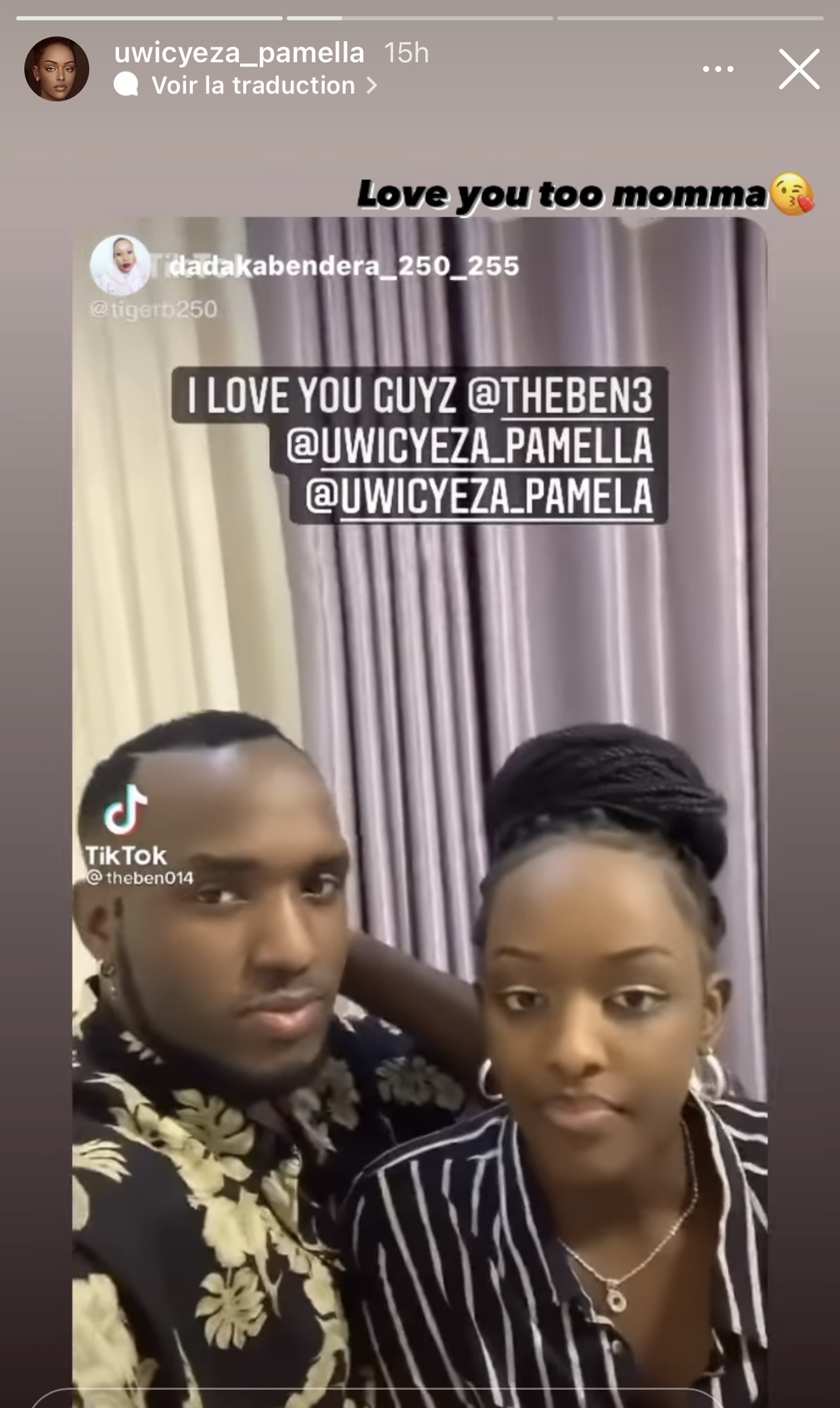Abinyujije kuri story ya instagram ye, Tidjara Kabendera yanditse amagambo agira ati « I love you guyz @theben3 @uwicyeza_pamella ».