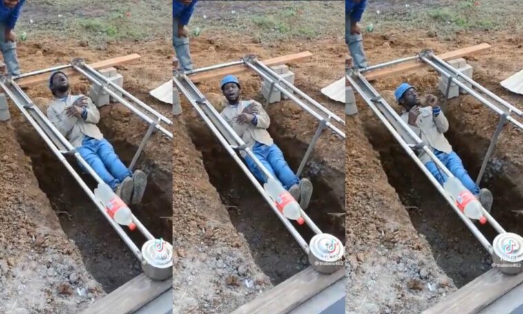 Ku mbuga nkoranyambaga hasakajwe amashusho y’umugabo wabonaga anezejwe no kuryama ku migozi isanzwe ishyirwaho isanduku y’umuntu ugiye gushyingurwa ngo yurutswe mu mva neza ,gusa uwo mugabo we yirambitse kuri iyo migozi ikajya imumanura mu mwobo bashyinguramo ari nako atumagura itabi ubona anezerewe.