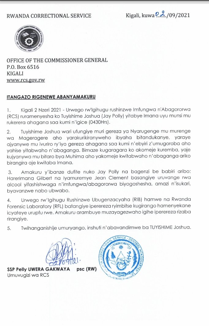Mu masaha make ashize, Urwego rw’igihugu rushinzwe imfungwa n’abagororwa rwashyize hanze itangazo rivuga ko Jay Polly na bagenzi be babiri basangiye uruvange rwa Alcool yifashishwagwa n’imfungwa/abagororwa biyohoshesha, amazi n’isukari byavanzwe n’abo ubwabo ibi akaba aribyo byaviriyemo Jay Polly kubura ubuzima.
