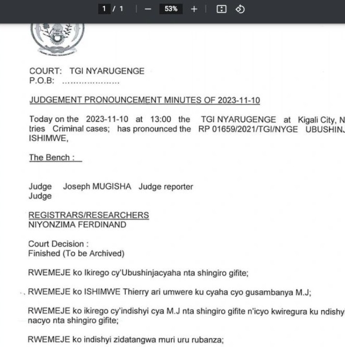 Icyemezo cy’Urukiko ku ndishyi Titi Brown yatse nyuma yo kumara imyaka 2 muri gereza none akaba agizwe umwere