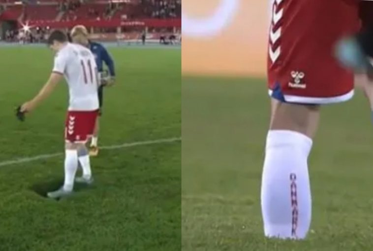 Uyu mukinnyi ukinira ikipe y’igihugu ya Dernmark yagaragaje ari kugerageza gukura ukuguru kwari kwafatiwe mu bitaka byo mu kibuga cy’umupira w’amaguru.