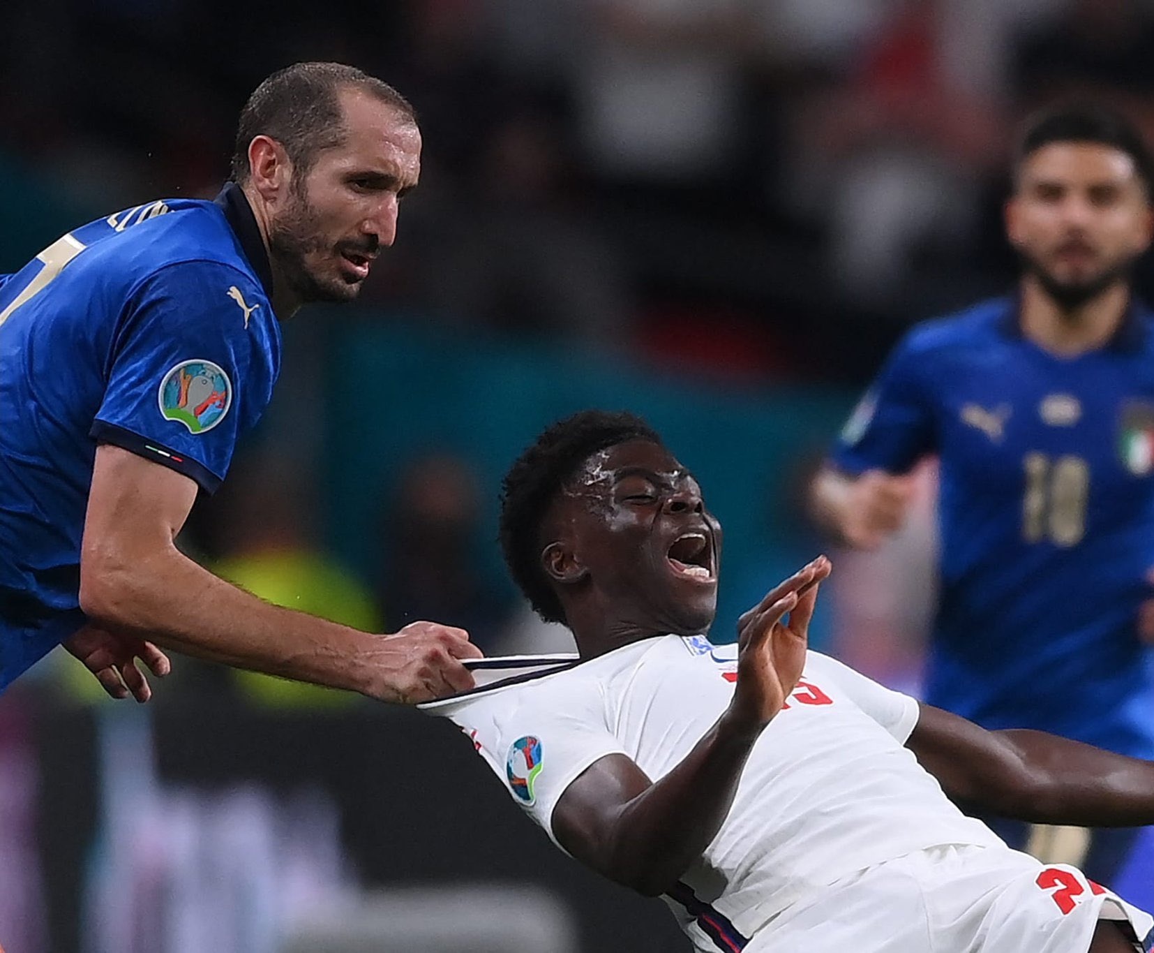 Mu mukino wa nyuma wabaye ku munsi w’ejo abantu benshi basigaranye mu ntekerezo zabo ishusho ya Kapiteni w’Ubutaliyani, Giorgio Chiellini, ubwo yakururaga Bukayo Saka akamutura hasi ibyamuviriyemo guhabwa ikarita y’umuhondo. Hari ku munota wa 96 w’umukino. Ifoto ya Chiellini akurura Saka niyo foto twabahitiyemo nk’ifoto yo kuri uyu munsi.