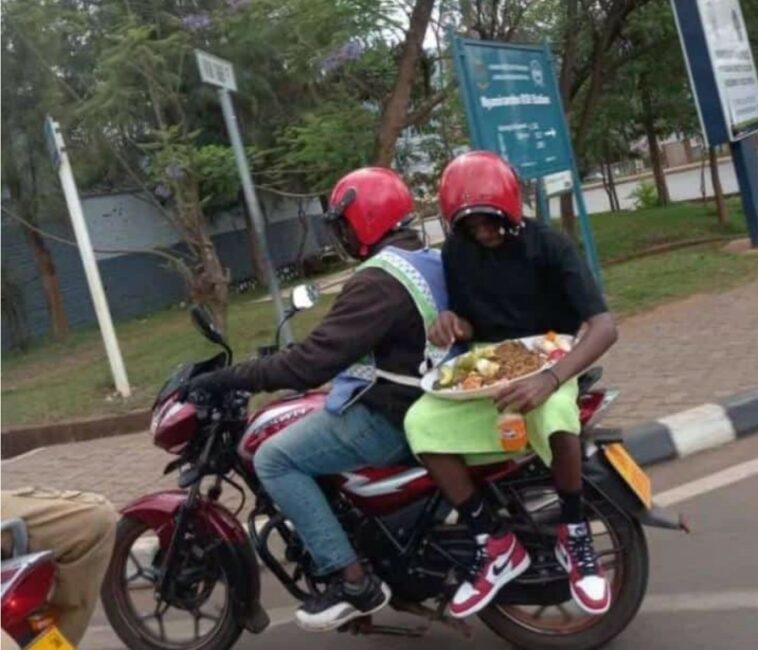 Ku mbuga nkoranyambaga zigiye zitandukanye hakomeje gusakara ifoto y’umusore wateze moto acigatiye isiniya yuzuye ibiryo bitetse neza.