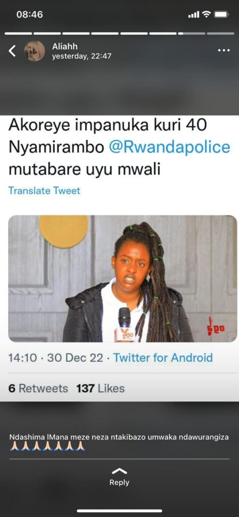 Gusa yifashishije screenshot yari akuye ku rubuga rwa twitter ,aho hari uwari watangaje ko Alliah akoreye impanuka kuri 40 ,Alliah yahise agira ati :” ndashima Imana ,meze neza umwaka ndawurangiza”