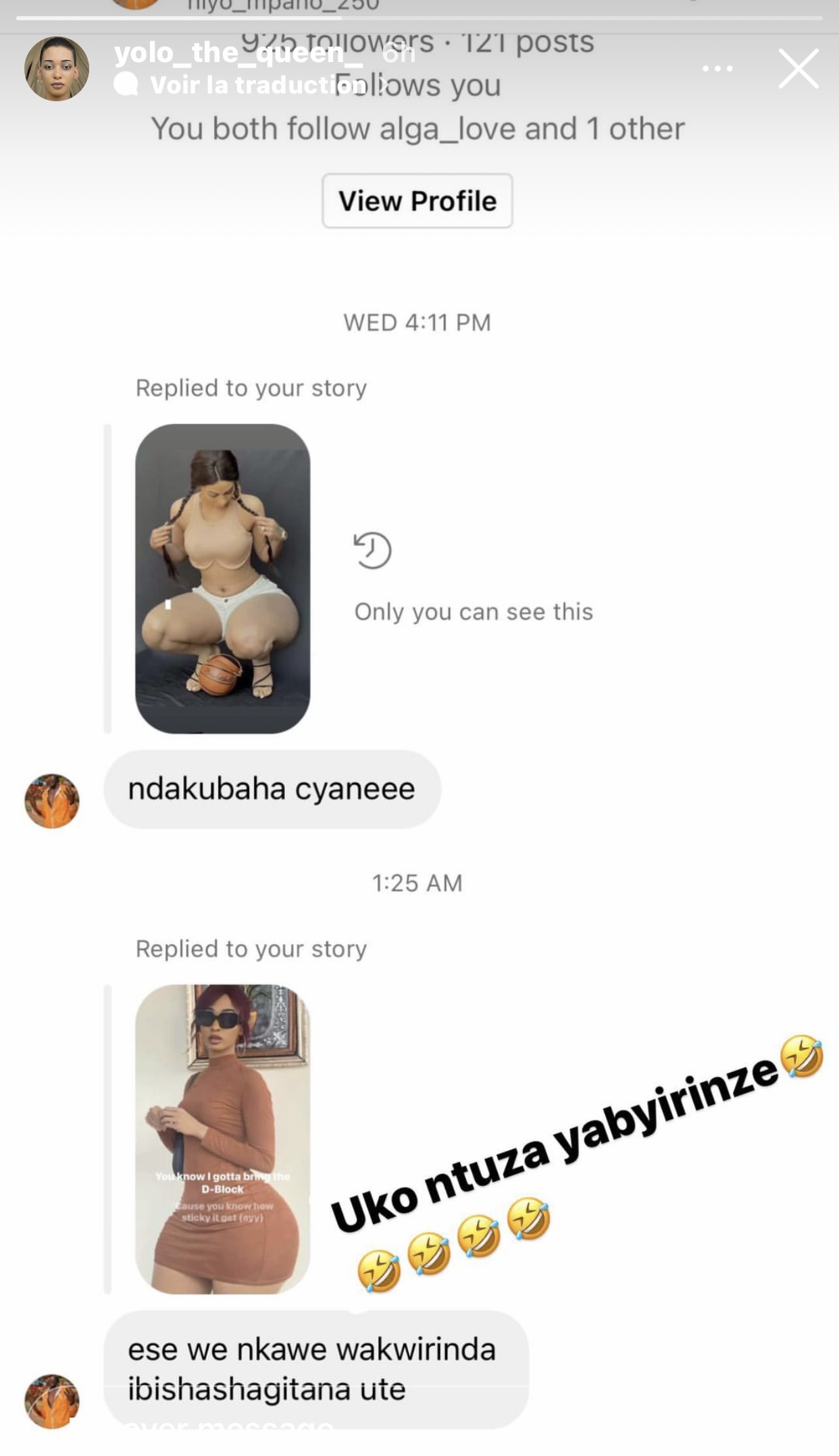 Nyuma y’ibi byose byabaye, umwe mu bafana ba Yolo The Queen bamukurikira kuri instagram yabajije Yolo The Queen ati « ese we nkawe wakwirinda ibishashagirana ute ». Yolo The Queen yahise amusubiza mu magambo agira ati « Uko ntuza yabyirinze 🤣🤣🤣🤣🤣 ».