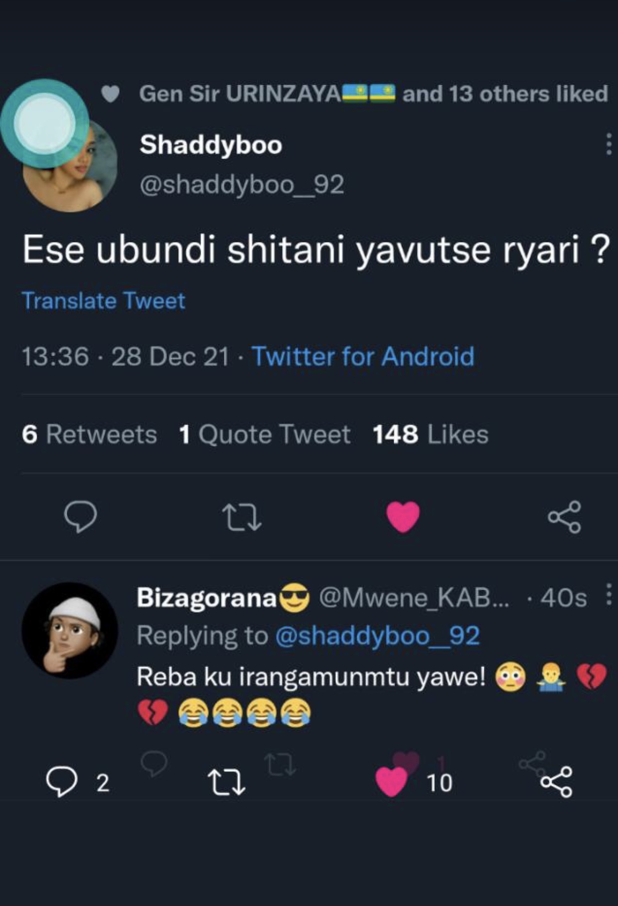 Ku munsi w’ejo nibwo Shaddyboo abinyujije ku rukuta rwe rwa Twitter yanditse amagambo avuga ati « Ese ubundi shitani yavutse ryari? ». Nyuma yuko Shaddyboo yanditse aya magambo kuri Twitter ye, umwe mu bafana be bamukurikira yahise amusubiza mu magambo agira ati « Reka ku irangamuntu yawe! »