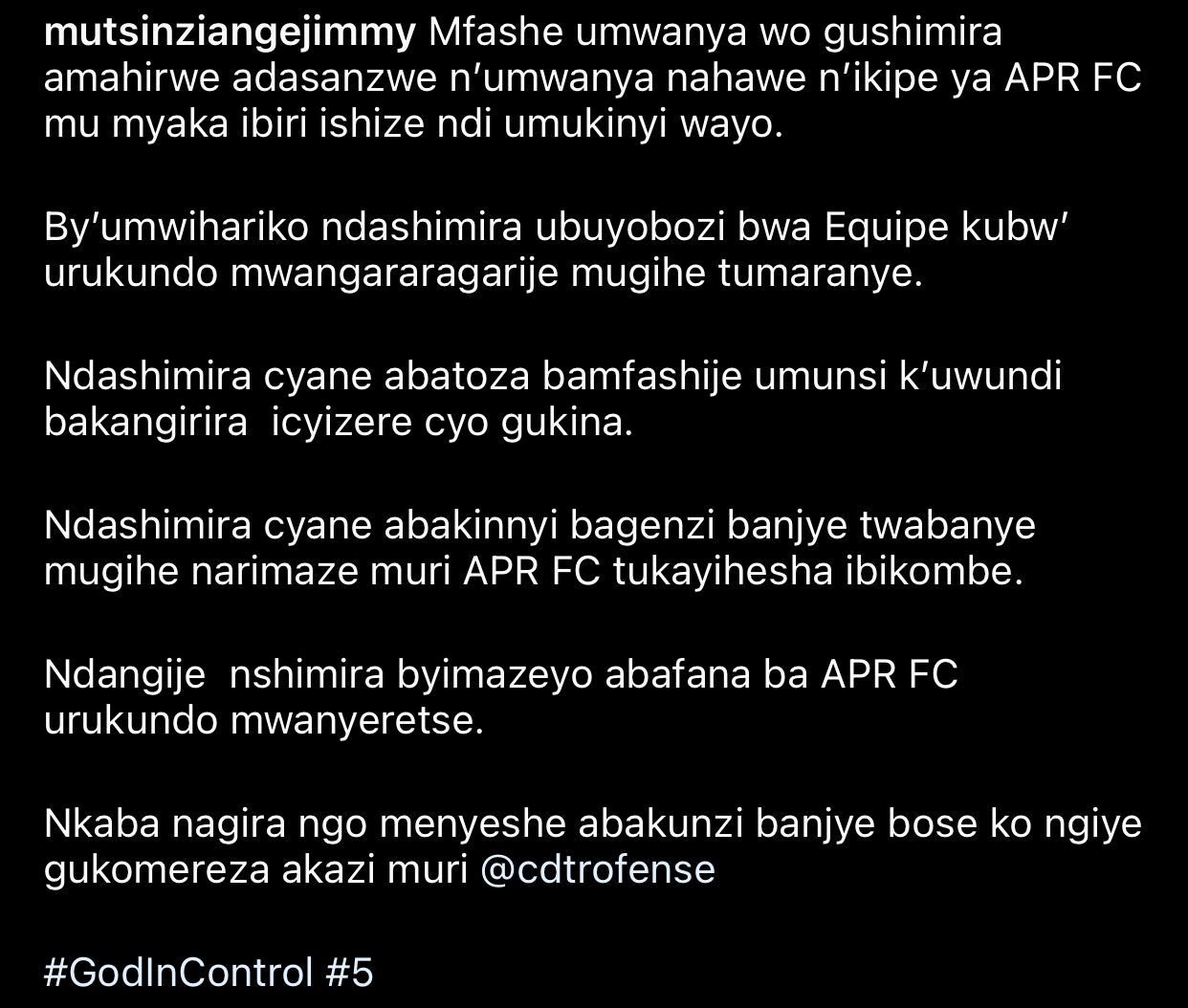 Mutsinzi Ange abinyujije ku rukuta rwe rwa instagram yanditse amagambo yuzuyemo amarangamutima menshi no gushima by’umwihariko Ubuyobozi bwa APR FC.