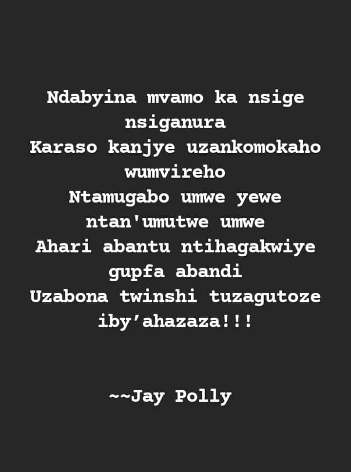 Ku munsi w’ejo nibwo umuhanzi Tuyishime Joshua uzwi nka Jay Polly yitabye Imana. Uyu mugabo yagiye atanga ubutumwa bwinshi ku ndirimbo ze zitandukanye harimo umusaraba wa Joshua, akanyarirajisho n’izindi. Nubwo Jay yatanze ubutumwa bwinshi mu ndirimbo ze gusa hari ijambo rikomeye yavuze mu minsi ye ya nyuma ritazasibangana ku mitima y’abafana be. Iryo jambo ni iri rikurikira: