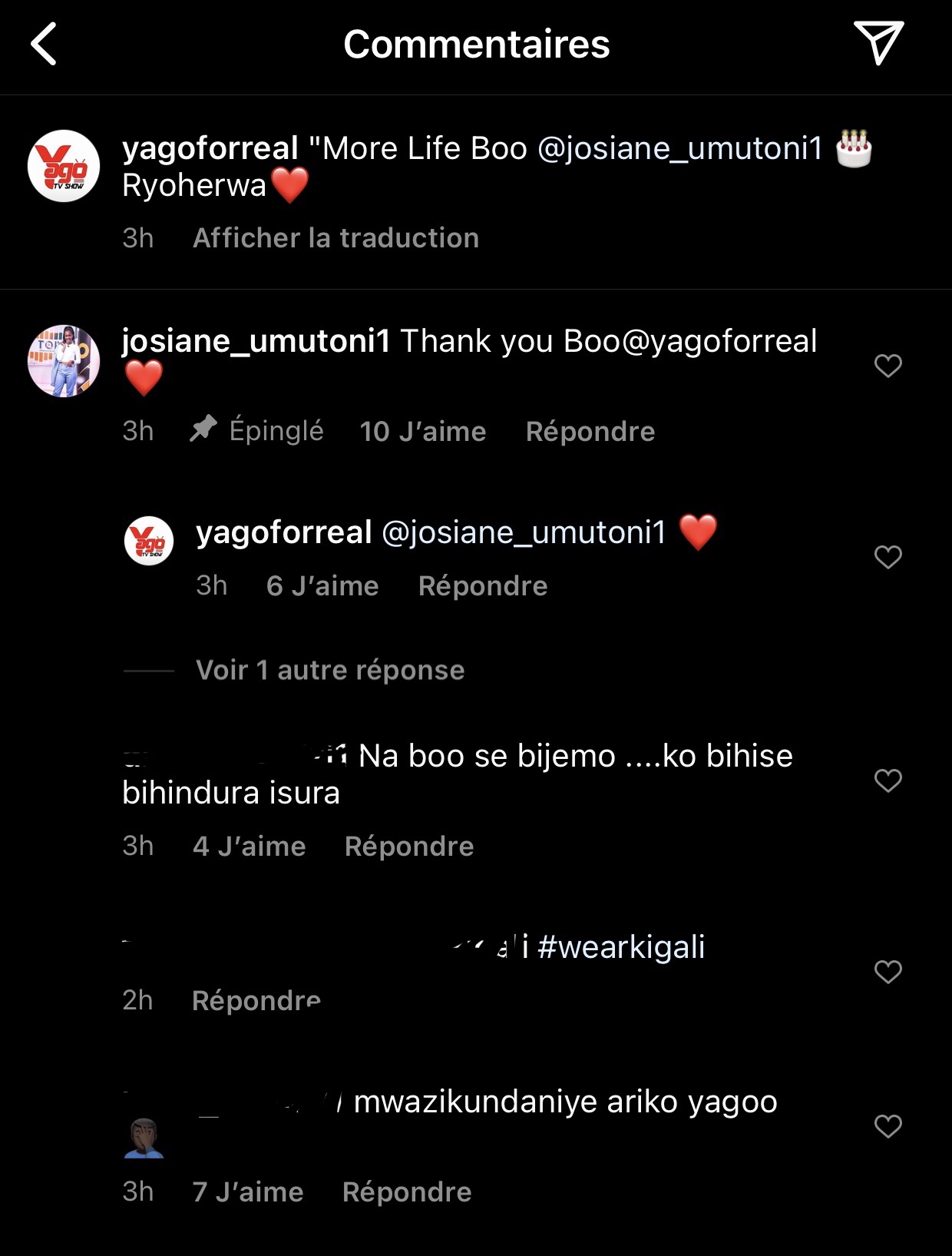 Nyuma yuko Yago atangaje aya magambo, Josiane yahise amusubiza mu magambo agira ati « Thank you Boo @yagoforreal❤️». Bamwe mu bakurikirana Yago babonye aya magambo yanditse bagiye bibaza niba nta kanunu k’urukundi kaba kihishe inyuma y’aya magambo maze Yago araruca ararumira ntiyagira ibyo abasubiza.