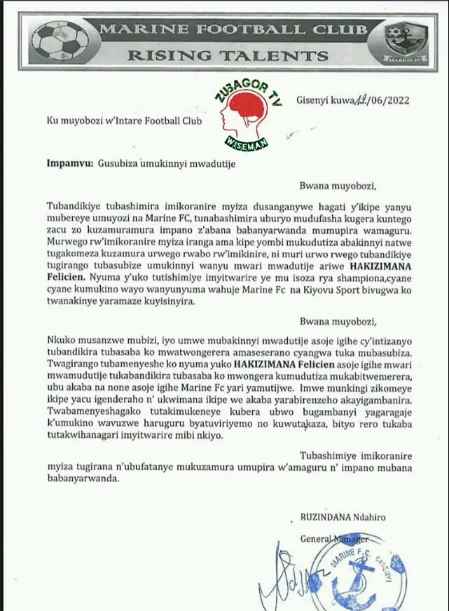 Ikipe ya Marine Fc yamaze kwandikira Intare Fc ibaruwa ibasubiza umukinnyi wabo HAKIZIMANA Felicien kubera ngo yagambaniye ikipe ya Marine Fc.