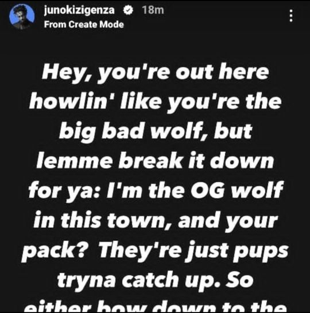 Juno Kizigenza yagaragaje kutanyurwa no kubona Bruce Melodie n’ikipe ye irimo Coach Gael biyita ibirura, avuga ko ahubwo ari utubwana (ibirura bito) ariko ahamya ko ariwe kirura gikuru.