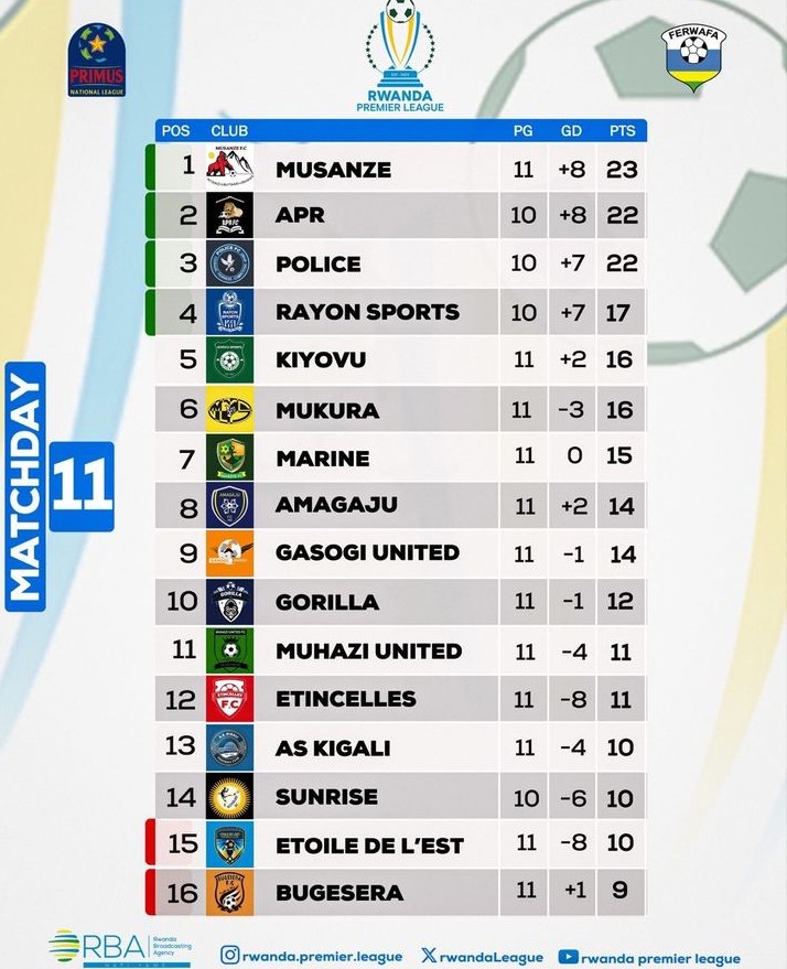 Ikipe ya Musanze FC ikomeje kuyobora urutonde rwa Shampiyona y’umupira w’amaguru mu Rwanda igeze ku munsi wa 11.