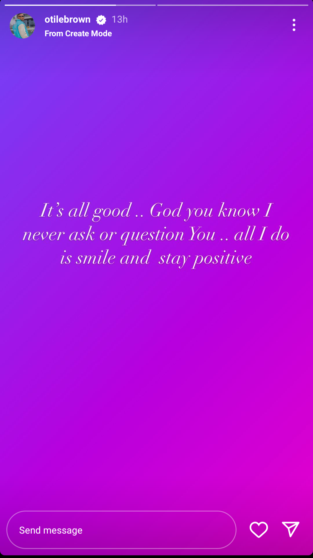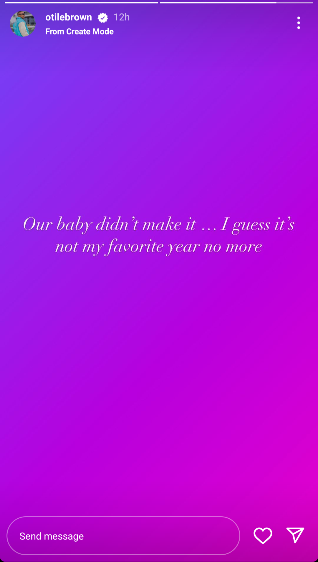 Atile Brown yagize ati:” Imana nayo irabizi ko iteka mpora nishimye kandi ndimo guseka gusa kuri iyi incuro sinzi niba ndabibasha.Umwana wacu ntabwo yabashije kubikora.Ndakeka uyu mwaka atari umwaka wanjye w’amahirwe habe nagato”.