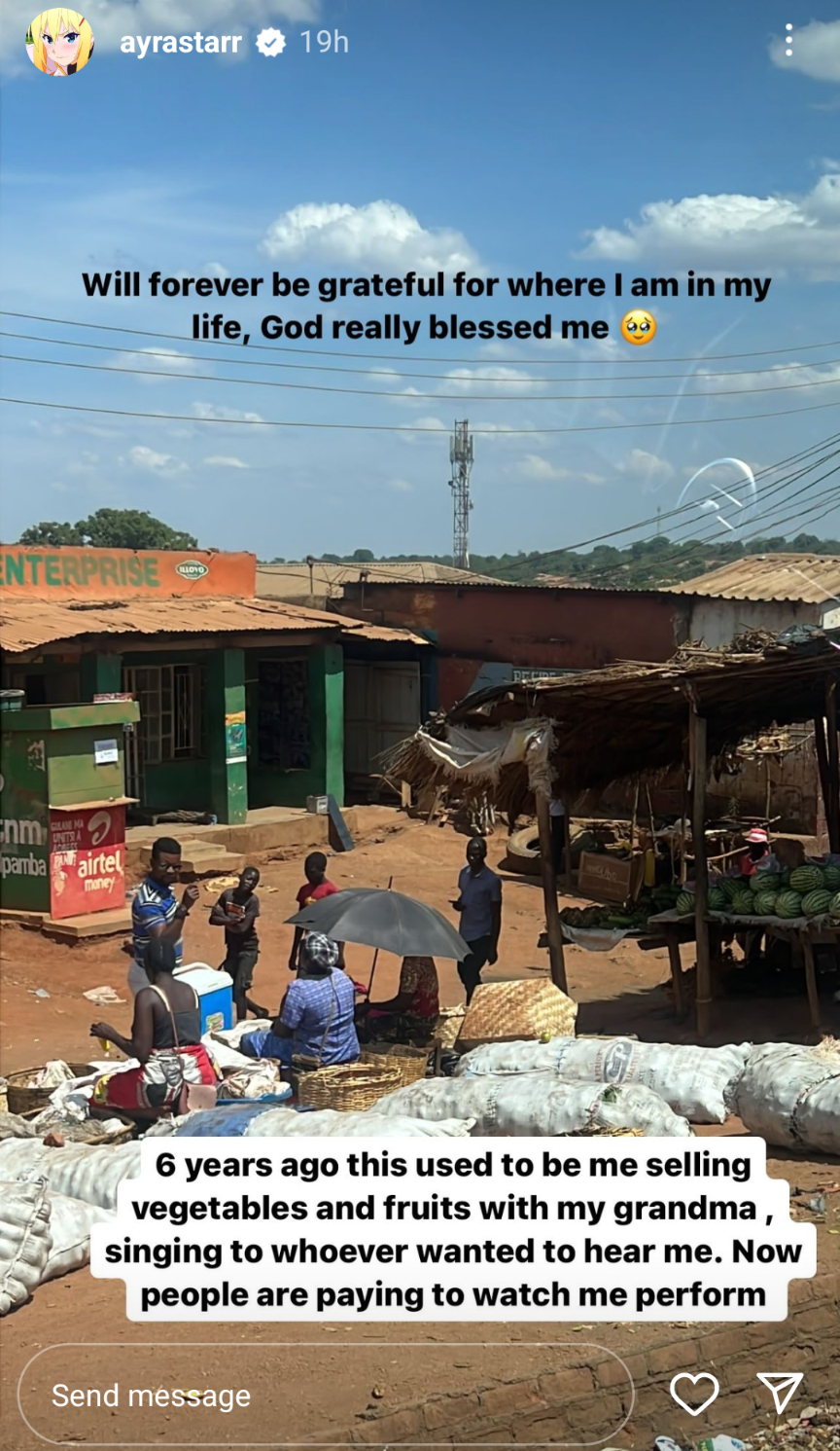 Umuhanzikazi w’umunyaNigeria Ayra Star uri mu bakunzwe cyane hano muri Afurika ndetse no ku Isi abinyujije ku mbuga nkoranyambaga ze yashimiye Imana yamukuye mu kazi k’ubuzunguzayi yakoranaga na Nyirakuru.