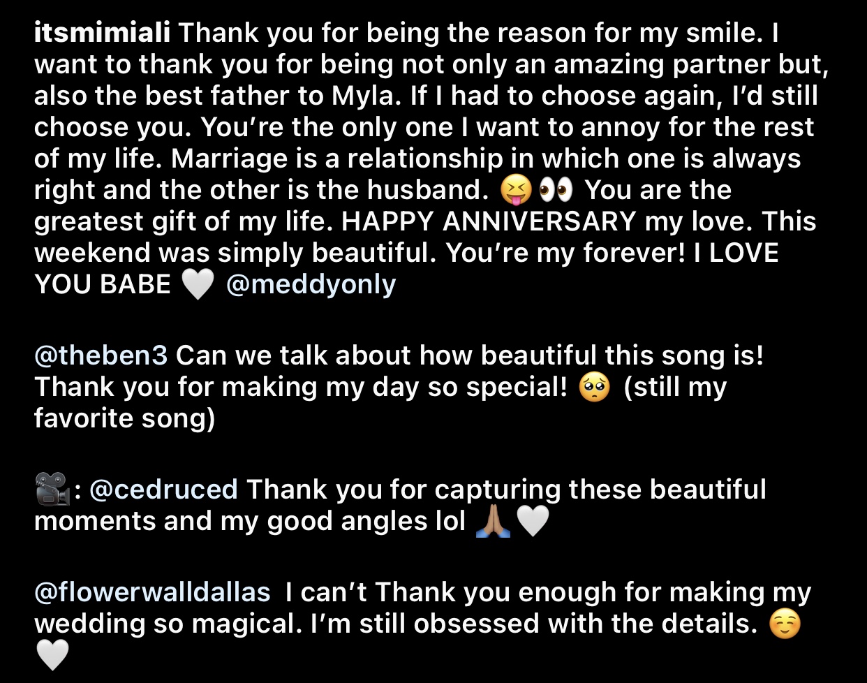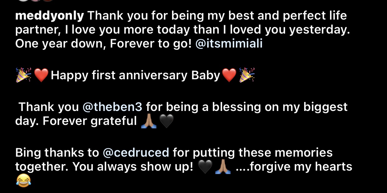 Hari ku ya 22 Gicurasi 2021 nibwo umuhanzi Meddy yarushinze na Mimi ni mu muhango wabereye i Dallas ho muri Leta zunze ubumwe za Amerika. Ku ya 22 Gicurasi 2022, umwaka umwe urashize neza Meddy na Mimi barushinze. Aba bombi babinyujije ku nkuta zabo za instagram bagaragarizanyije urukundo ndetse banaterana imitoma bashimangira urukundo bakundana nyuma y’umwaka umwe bamaze barushinze.