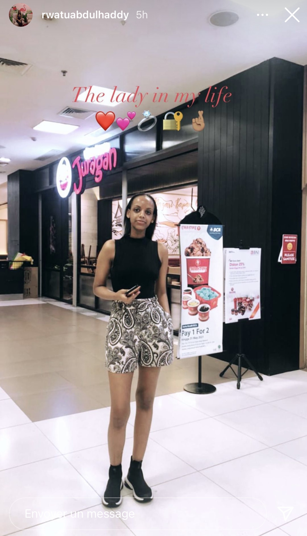 Abdoul Rwatubyaye abinyujije kuri story ya instagram ye yashyize hanze ifoto y’umugore we, Hamida, maze ayiherekesha amagambo agira ati «The lady in my life ❤️💕💍🔐🤞🏼».