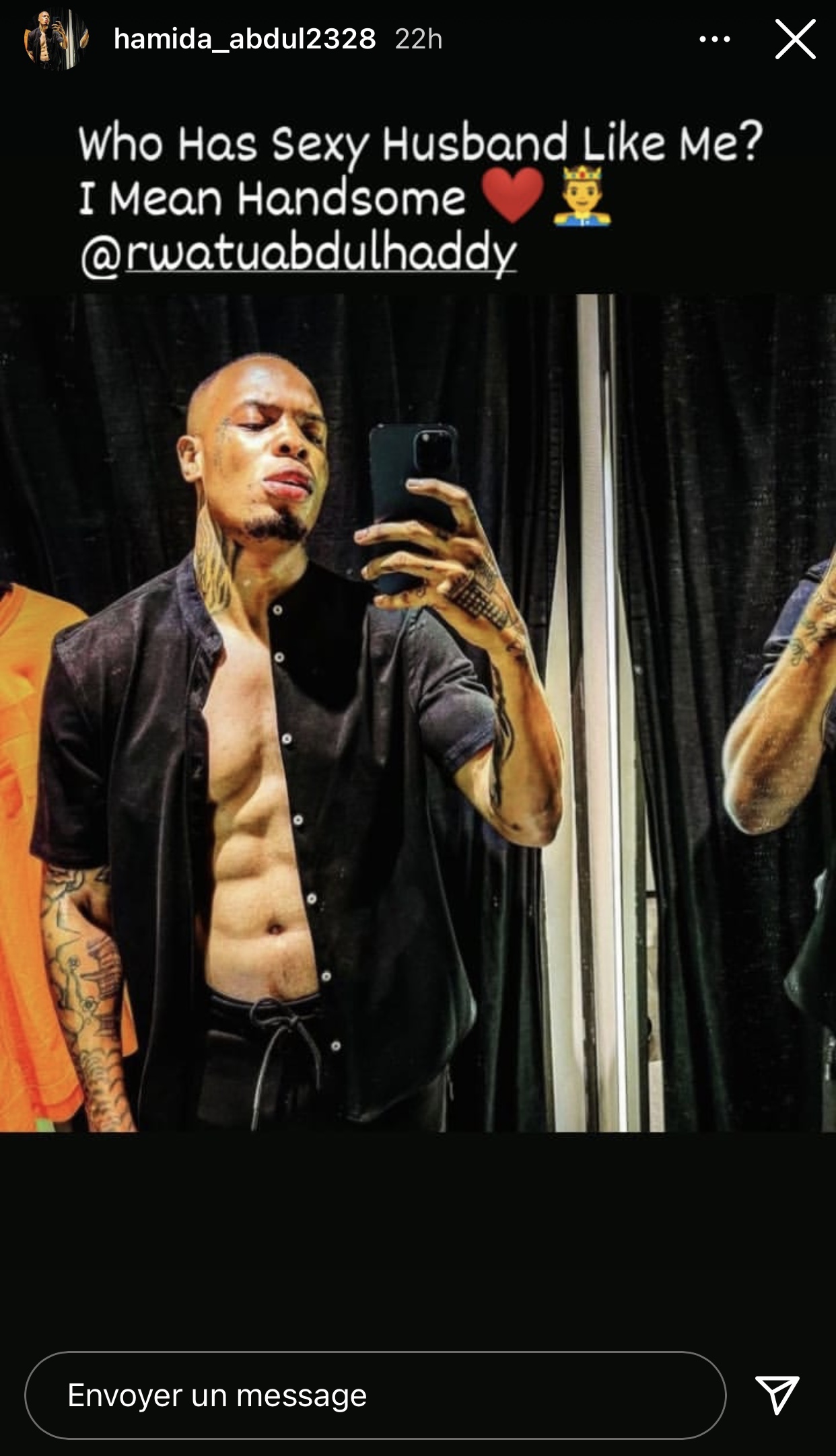 Ku rundi ruhande, Hamida nawe yashyize hanze ifoto ya Rwatubyaye maze ayiherekesha amagambo agira ati « Who has a sexy Husband Like Me? I Mean Handsome ❤️🤴@rwatuabddulhaddy ».