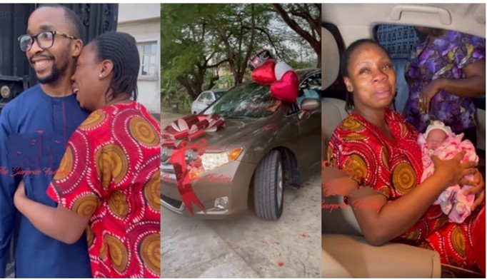 Umubyeyi yananiwe kwihangana maze arira amarira y’ibyishimo nyuma yo guhabwa impano y’imodoka n’umugabo we ,ubwo yayimuzaniraga amutunguye.Ni nyuma y’aho uyu mugore wo muri Nigeriya uherutse kubyara yakiriye Toyota Venza nshya kumugabo we nkimpano yo kuba yaramubyariye umwana.