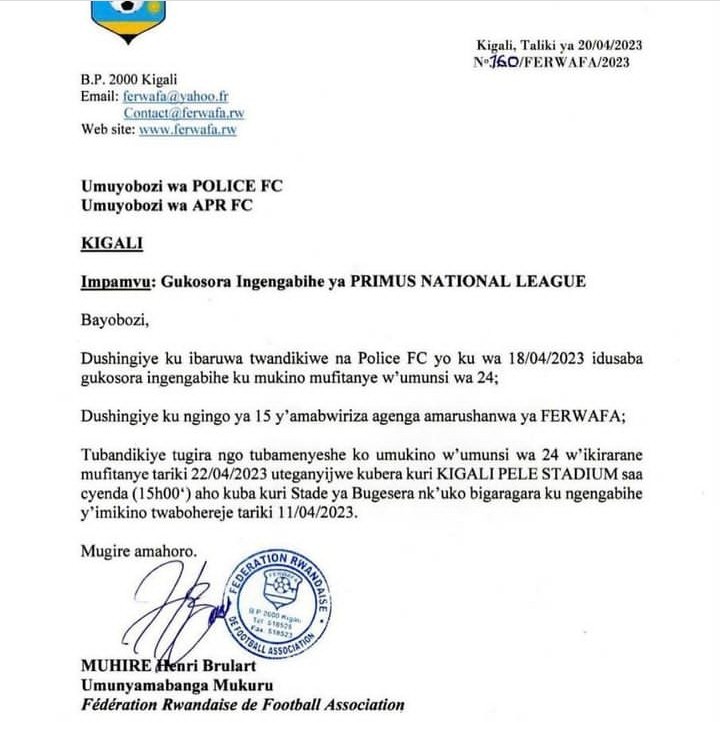 Impinduka: FERWAFA yatangaje ko umukino w’ikirarane uzahuza APR FC na Police FC utakibereye i Bugesera – Ibaruwa