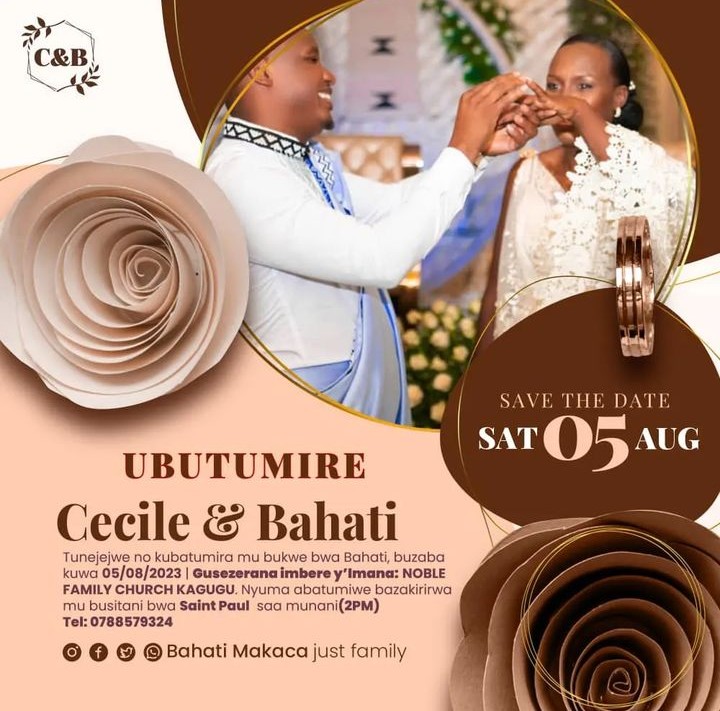Muraho neza! Habayeho impinduka: Gusezerana imbere y’Imana bizabera ku rusengero rwa NOBLE FAMILY CHURCH KAGUGU. Nyuma abatumiwe bazakirirwa mubusitani bwa Saint Paul (Saa munani) amasaha ni yayandi saa munani muri saint Paul aho gusezeranira niho hahindutse Murakoze kwifatanya namwe nibyagaciro gakomeye