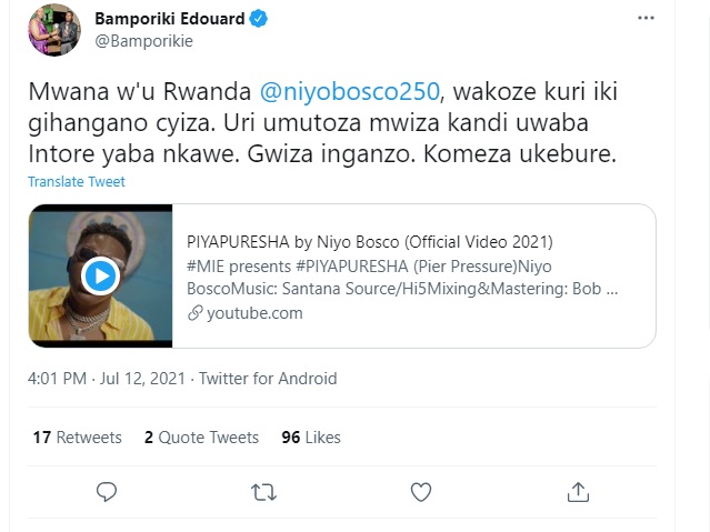 Mu butumwa yanyujije kuri Twitter, Bamporiki yagize ati “Mwana w’u Rwanda Niyo Bosco wakoze kuri iki gihangano cyiza. Uri umutoza mwiza kandi uwaba Intore yaba nkawe. Gwiza inganzo. Komeza ukebure.”