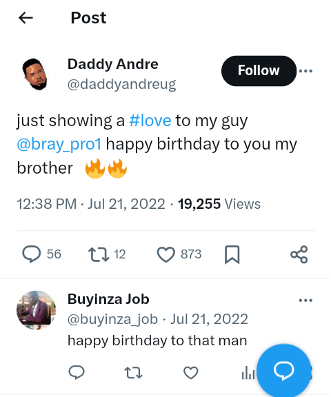 Uyu muhanzi Daddy Andre yaje no kwandika kuri Twitter ye yifuriza Director Bray Pro isabukuru nziza y’amavuko biza bishimangira umubano mwiza Bray Pro afitanye n’abaririmbyi b’abagande uyu Daddy Andre kandi afitanye indirimbo na Phil Peter bise “Cakula”.