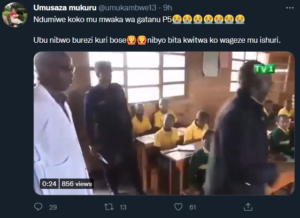 Ni amashusho y’ikinyamakuru cya TV1 yashyizwe hanze ku rubuga nkoranyambaga rwa twitter nukoresha mazina y’umukambwe agaragaza umunyeshuri wo mu mwaka wa gatanu y’amashuri abanza aho yananiwe kwandika ijambo ryoroshye Good Morning Sir aho we yiyandikiye Gudumoningisa mu kinyarwanda.