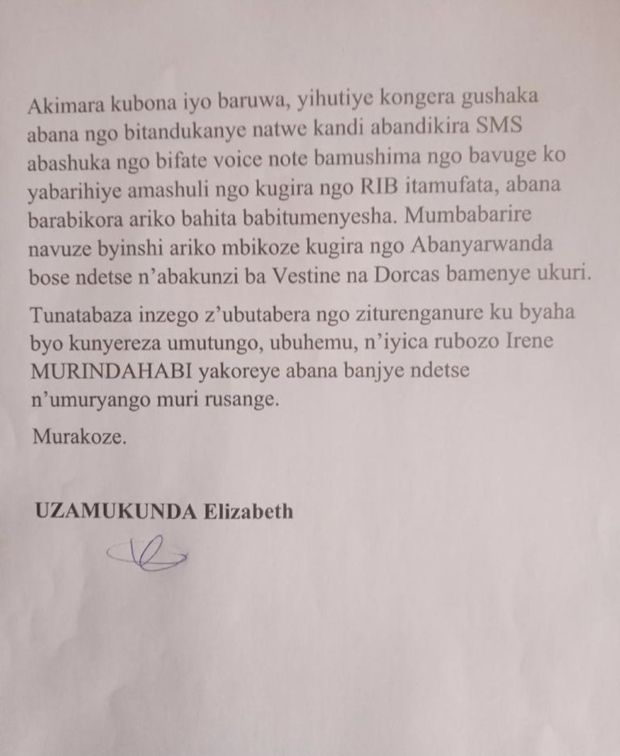 Mu izina ryanjye bwite, iry’umuryango wa Vestine na Dorcas ndetse n’iryumugabo wanjye S/Sgt NIZEYIMANA MAZIMPAKA, Njyewe UZAMUKUNDA Elizabeth nanditse iyi nyandiko kugira ngo nkureho urujijo ku mpamvu nyamukuru kandi zikomeye zatumye MURINDAHABI IRENE ENTERTAINMENT (MIE) ihagarariwe na MURINDAHABI Irene avuga ko ahagaritse imikoranire ye yariri hagati ye na Vestine & Dorcas.
