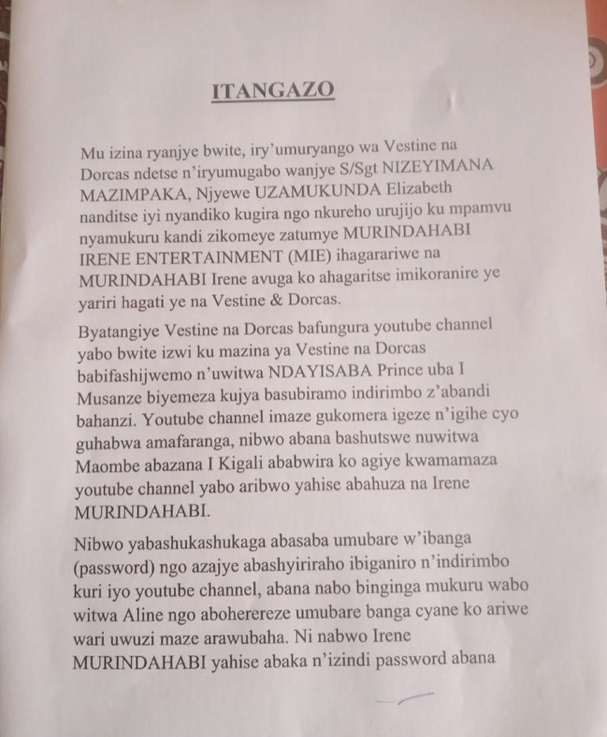 Nyuma y’aho gato hahise hajya hanze Itangazo ryashyizweho umukono na UZAMUKUNDA Elizabeth (Mama wa Vestine na Dorcas). Iri tangazo ririmo amagambo akurikira: