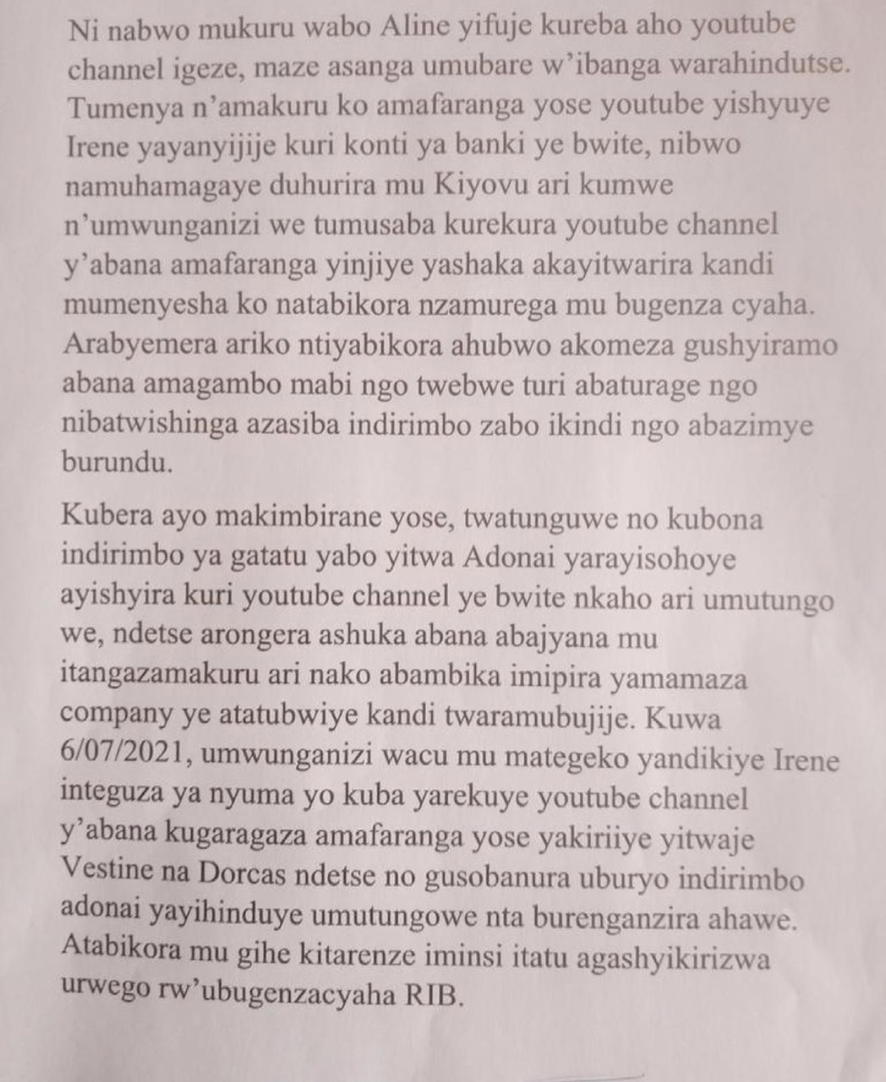 Ni nabwo mukuru wabo Aline yifuje kureba aho youtube channel igeze, maze asanga umubare w’ibanga warahindutse. Tumenya n’amakuru ko amafaranga yose youtube yishyuye Irene yayanyijije kuri konti ya banki ye bwite, nibwo namuhamagaye duhurira mu Kiyovu ari kumwe n’umwunganizi we tumusaba kurekura youtube channel y’abana amafaranga yinjiye yashaka akayitwarira kandi mumenyesha ko natabikora nzamurega mu bugenza cyaha. Arabyemera ariko ntiyabikora ahubwo akomeza gushyiramo abana amagambo mabi ngo twebwe turi abaturage ngo nibatwishinga azasiba indirimbo zabo ikindi ngo abazimye burundu.