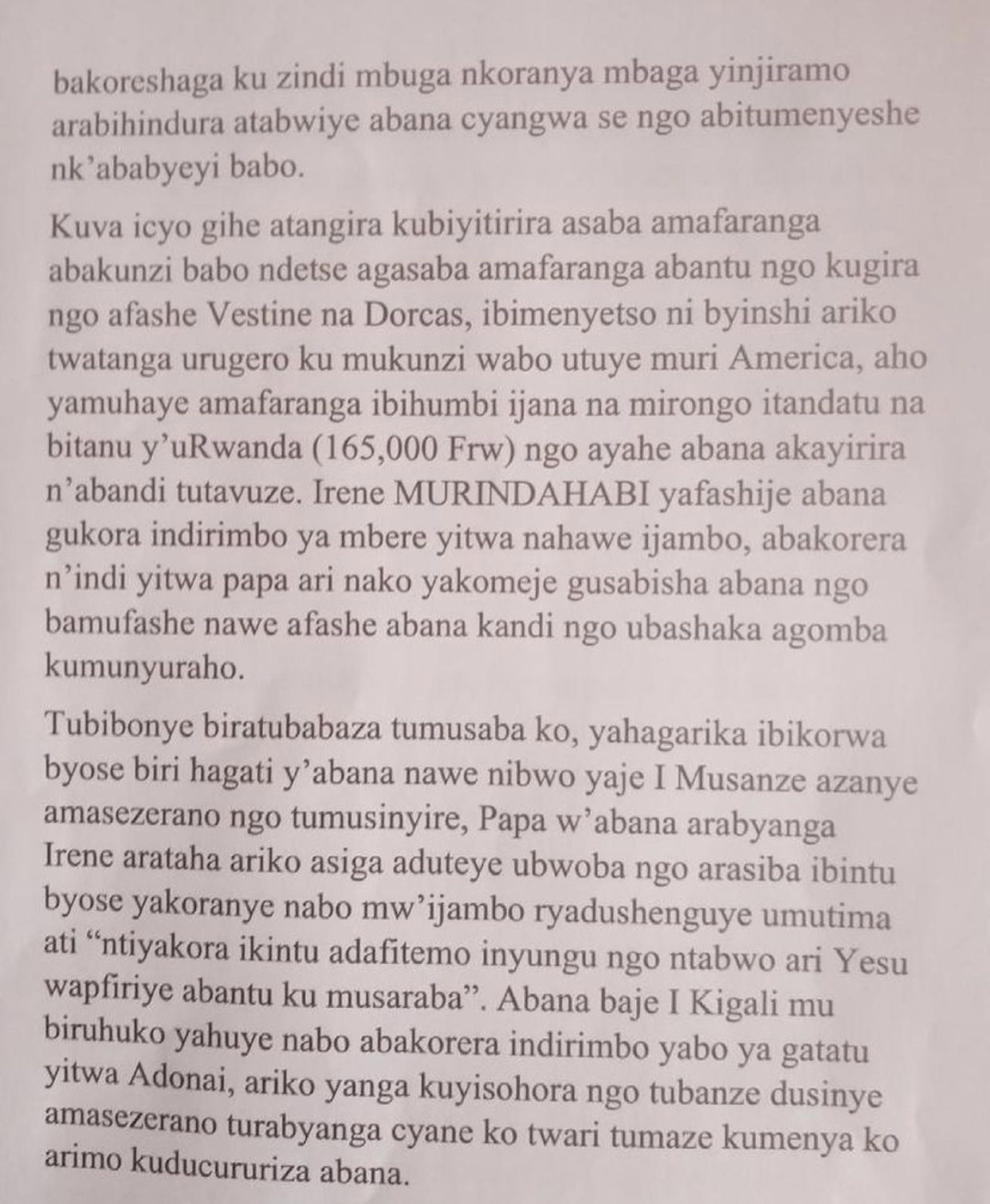 Akimara kubona iyo baruwa, yihutiye kongera gushaka abana ngo bitandukanye natwe kandi abandikira SMS abashuka ngo bifate voice note bamushima ngo bavuge ko yabarihiye amashuli ngo kugira ngo RIB itamufata, abana barabikora ariko bahita babitumenyesha. Mumbabarire navuze byinshi ariko mbikoze kugira ngo Abanyarwanda bose ndetse n’abakunzi ba Vestine na Dorcas bamenye ukuri.