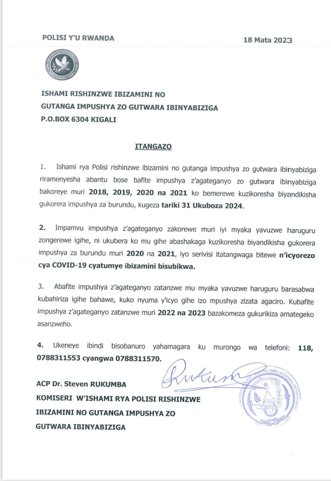 Ishami rya Polisi rishinzwe ibizamini no gutanga impushya zo gutwara ibinyabiziga riramenyesha abantu bose bashaka gukora uruhushya rwa’aburubdi bari bafite urw’amenyo babonye kuva muri 2019 kugeza 2021 bemerewe gukora.