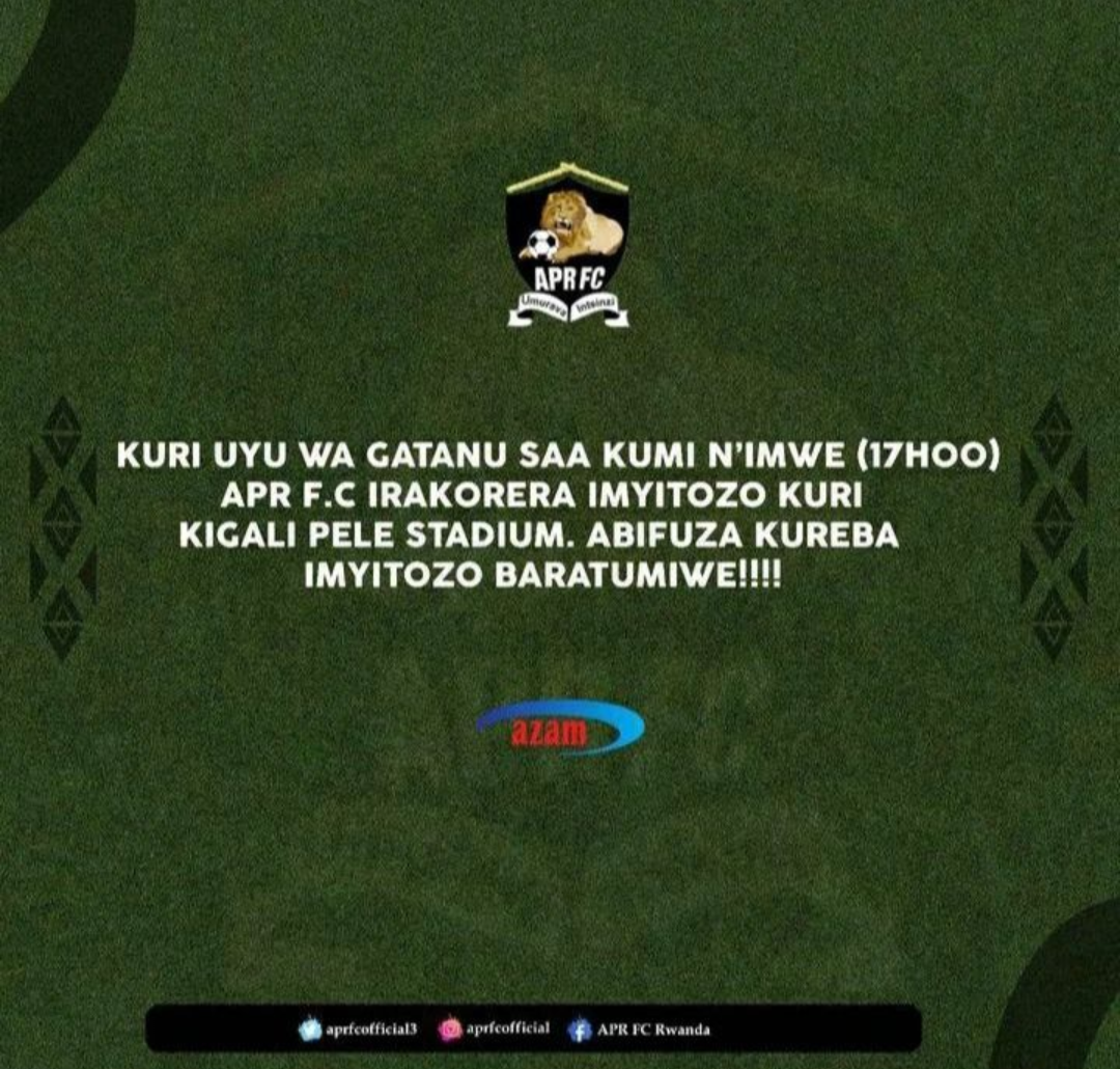 Kuri uyu wa gatanu tariki ya 21 Nyakanga 2023 guhera saa Kumi n’imwe 17:00 iyi kipe imaze gutangaza ko irakorera imyitozo ku kibuga Kigali Pele Stadium.