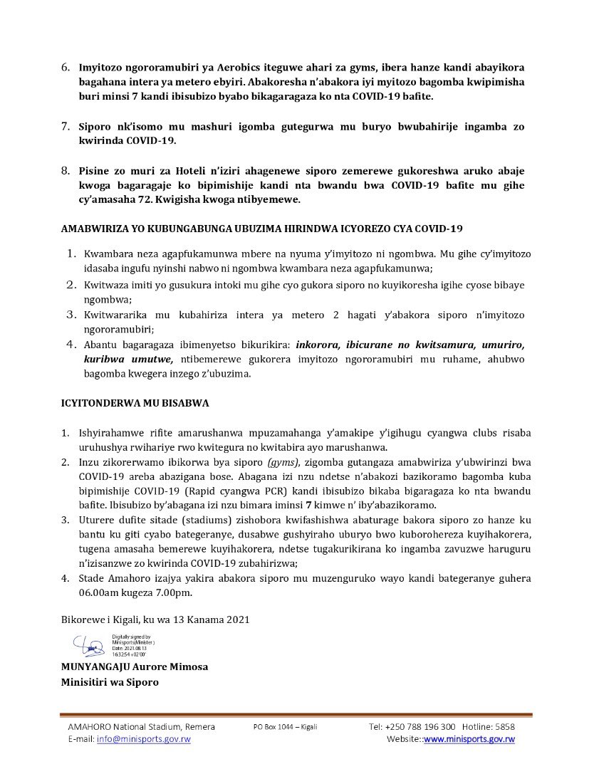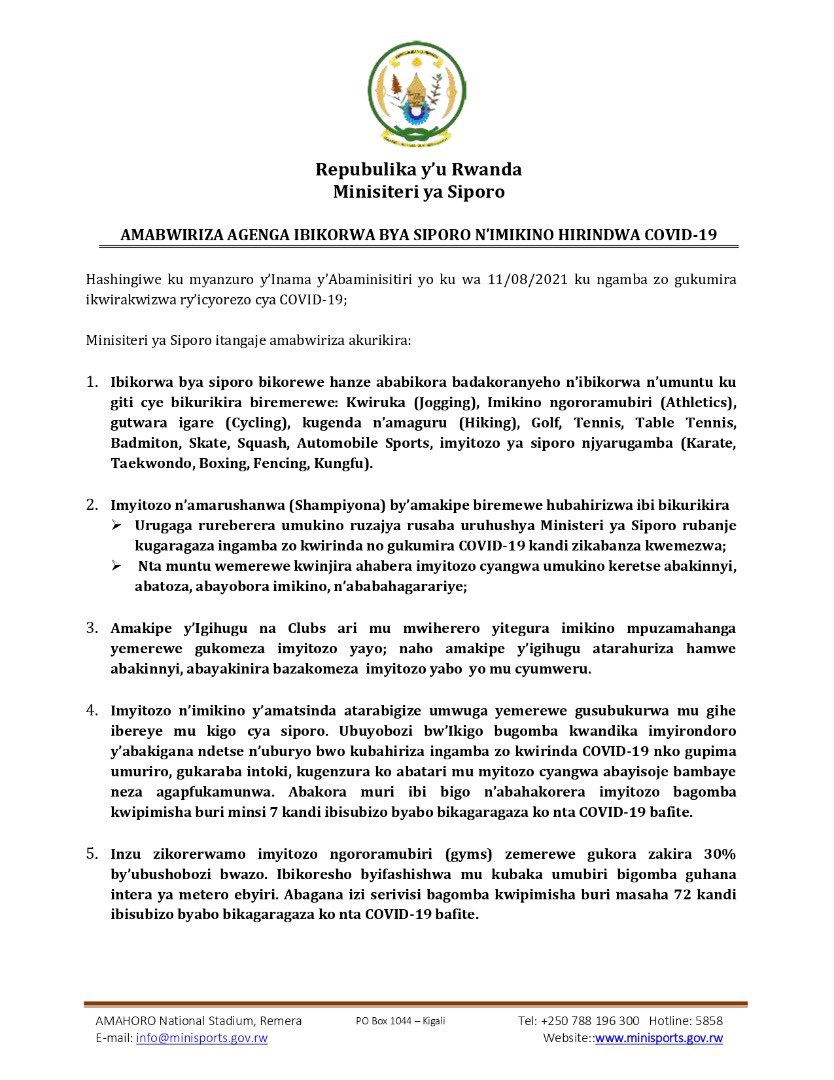 Minisiteri ya Siporo mu Rwanda yashyize hanze itangazo rikomorera bimwe mu bikorwa bya siporo n’imyitozo ngororamubiri.