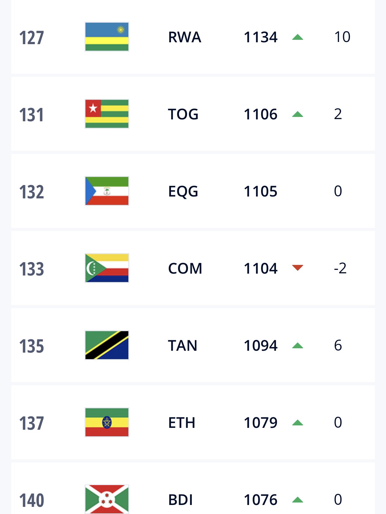 Kuri ubu Amavubi ari ku mwanya wa 127 ku isi izamutseho imyaka 10. Amavubi kandi kuri ubu ari ku mwanya wa 34 muri Africa.