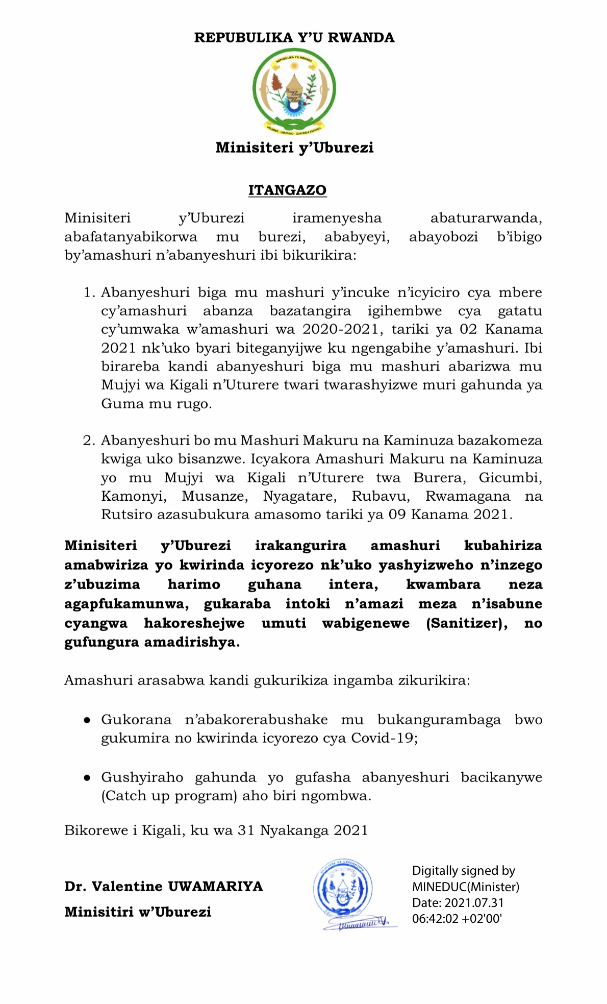 Nkuko bigaragara kuri iri tangazo rya MINEDUC, Abanyeshuri biga mu mashuri y’incuke n’abiga mu kiciro cya mbere cy’amashuri abanza bazatangira igihembwe cya gatatu cy’umwaka w’amashuri wa 2020-2021 Ku wa Mbere tariki ya 02 Kanama 2021 naho abiga mu mashuri makuru na Kaminuza batuye mu Mujyi wa Kigali no mu turere twa Burera, Gicumbi, Kamonyi, Musanze, Nyagatare, Rubavu, Rwamagana na Rutsiro bazasubukura amasomo ku wa Mbere tariki ya 09 Kanama 2021.